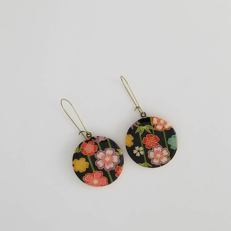 068 Multicolor Floral and Bamboo on Black Large Dangle Earrings